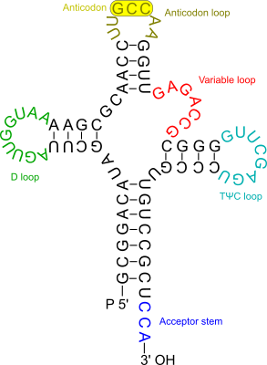 The simplified "cloverleaf" tRNA structure (from genome sequence of the bacterium Gardnerella vaginalis, as predicted by tRNAscan) for the glycine amino acid (GCC anticodon). Different parts of the structure highlighted and tagged. Drawn in Inkscape.