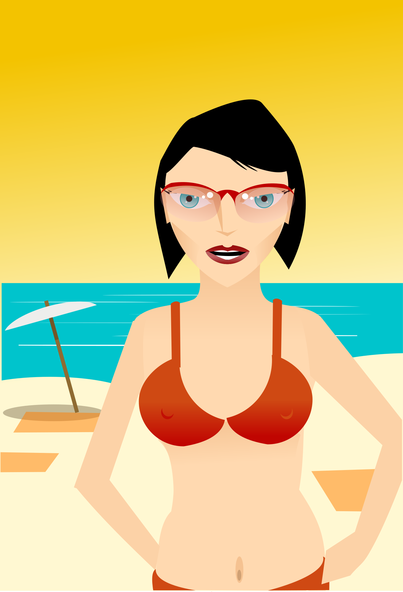 A girl with glasses in a swim suit at the beach.