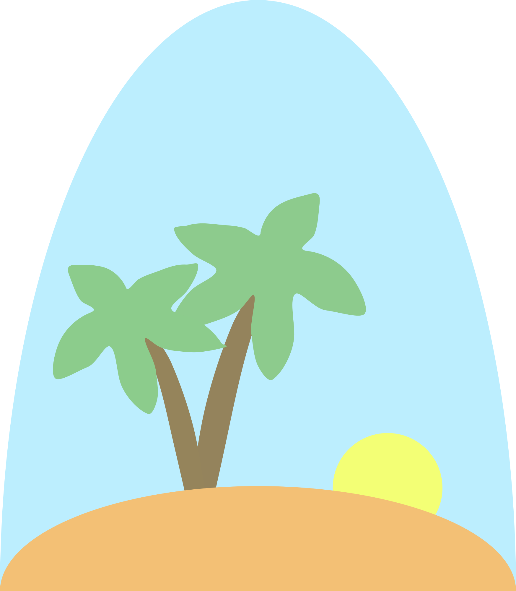 A very simple island scene, with sky, sun rising and coconut trees.