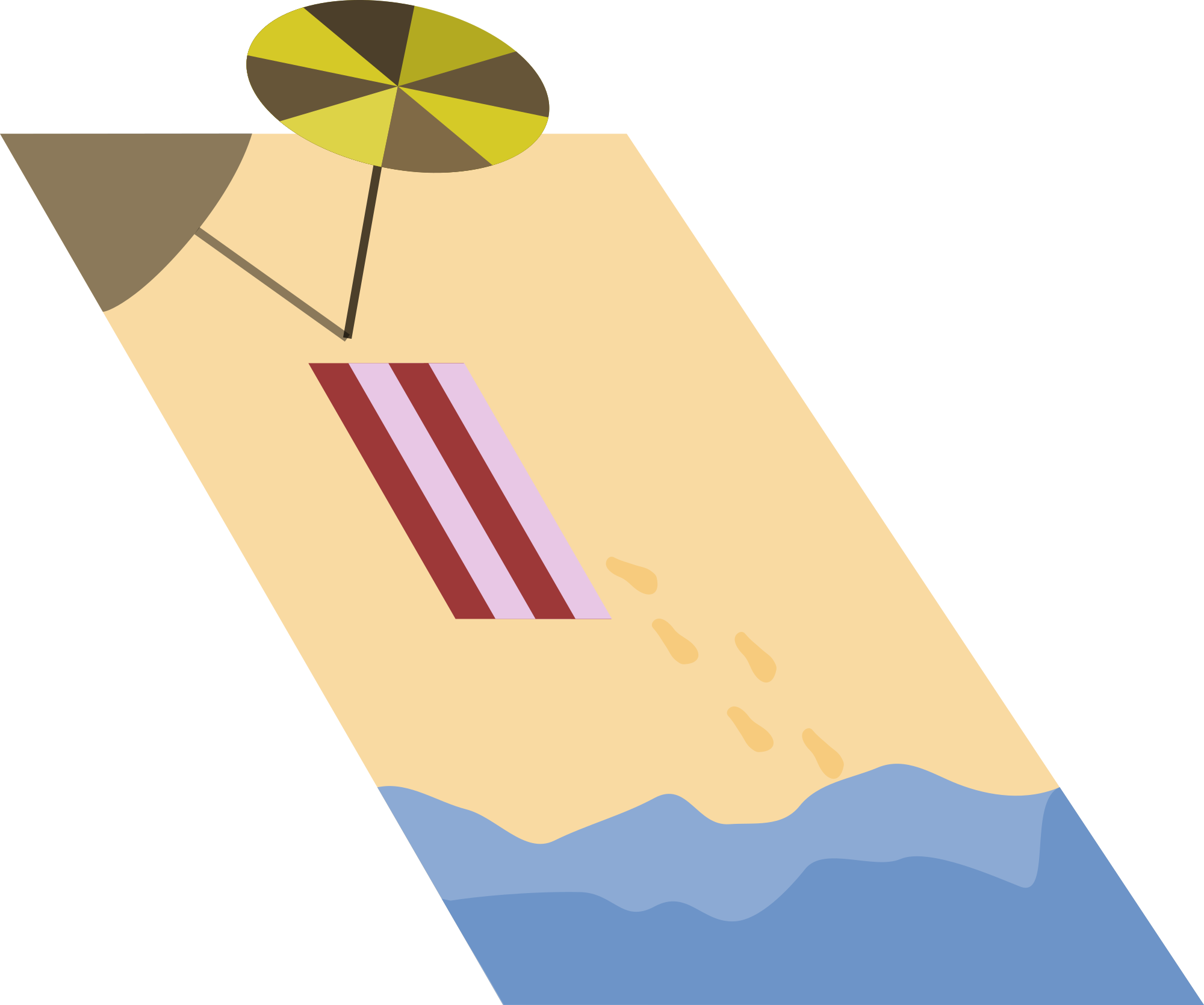 A beach seen from an above perspective, with beach umbrella, beach towel and footsteps.