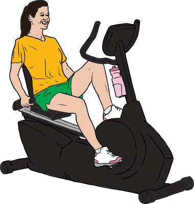 Color drawing of woman on recumbent exercise bike