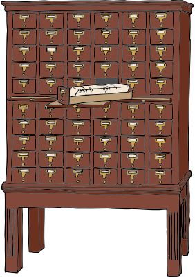 Color drawing of an old wood library card catalog