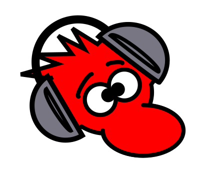 A red mouse cartoon with headphones on.