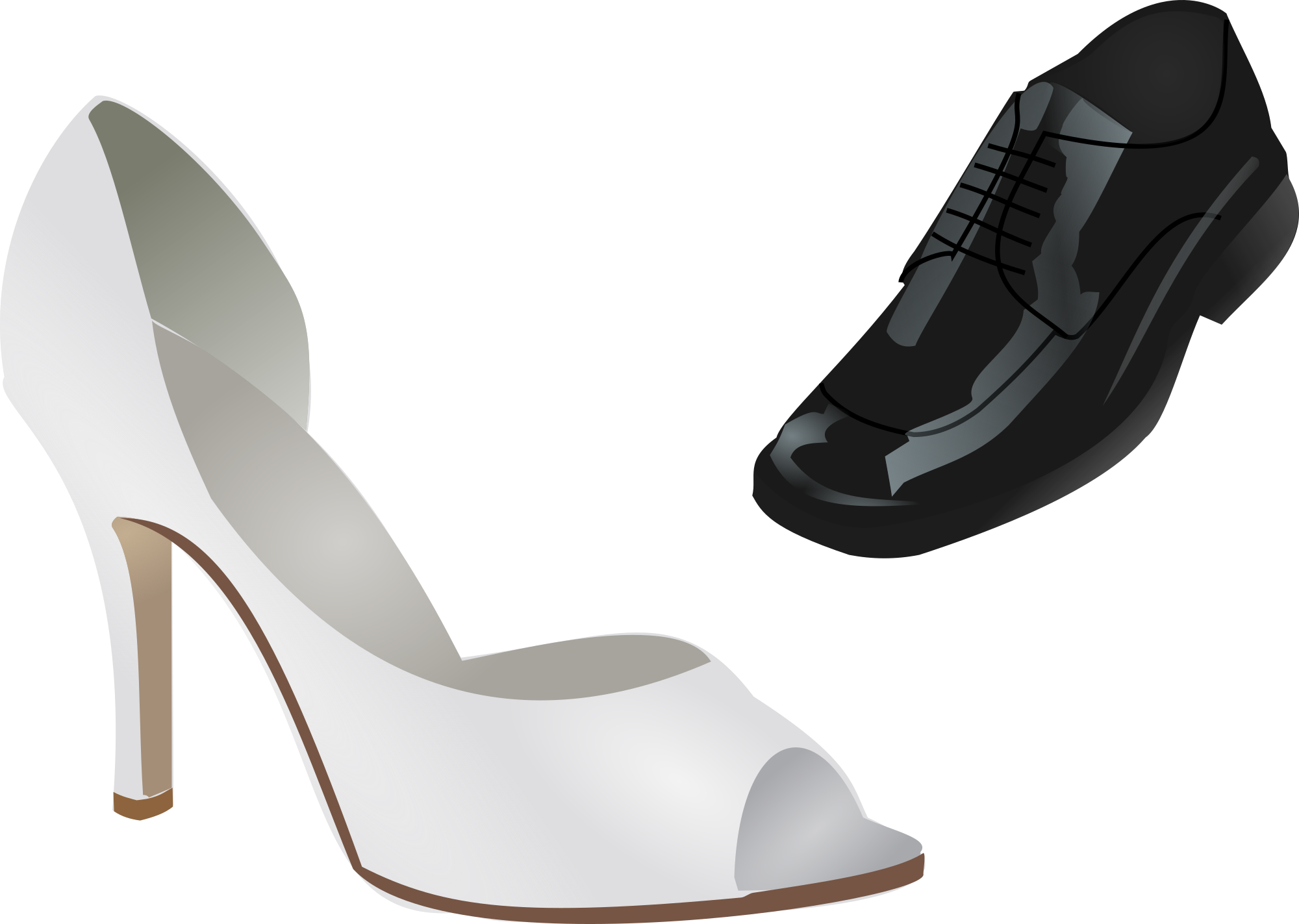 Two shoes: one for a woman, one for a man. Both shoes would fit well for a wedding or another celebration.