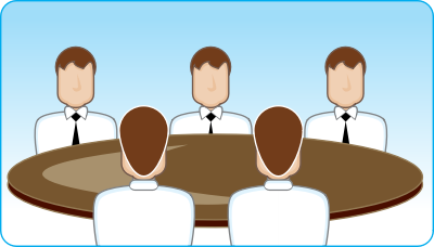 Icons of users sitting around a round table against a blue shaded background.