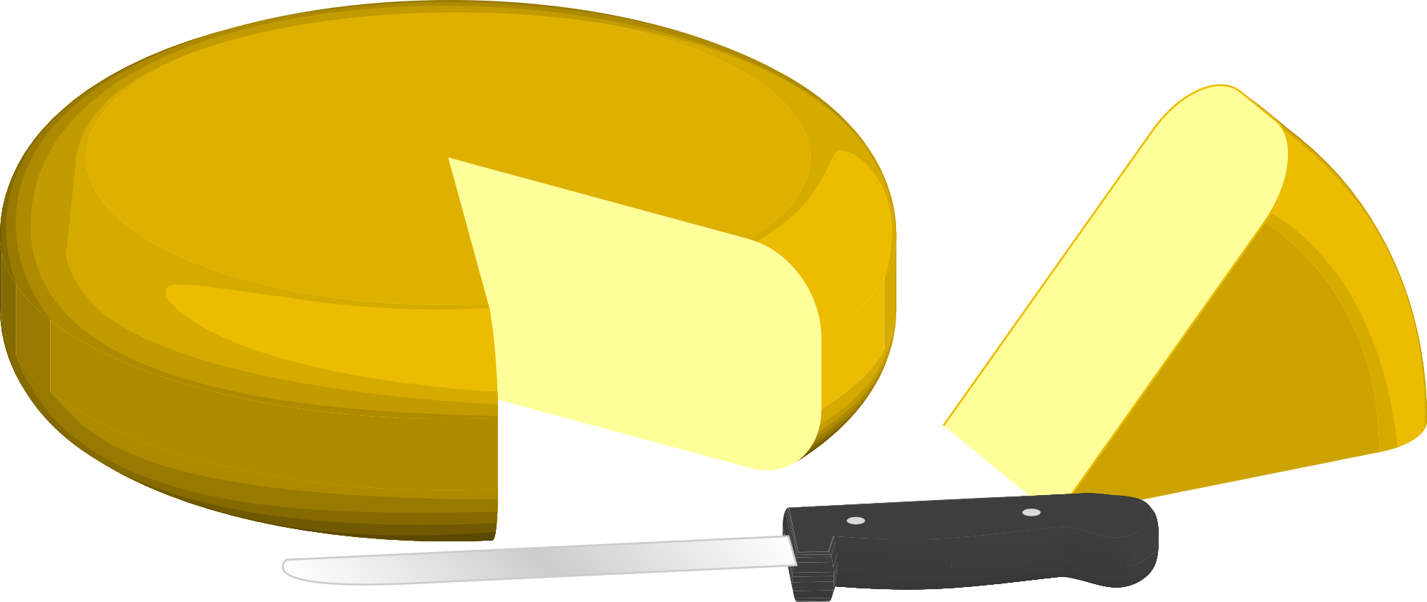 A wheel of cheese with a piece cut out and a knife in 3D.