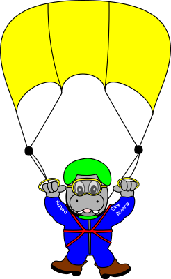 A cartoon sky diver hippo out having fun.