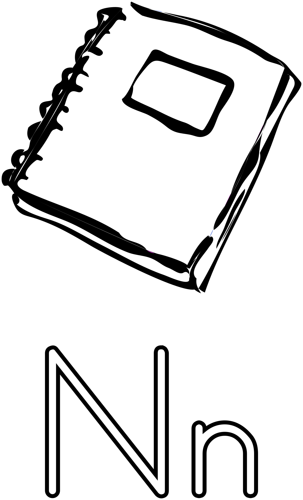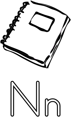 Outlines of an uppercase and lowercase letter n, with a notebook for coloring. Typeface is Let's Trace (public domain).