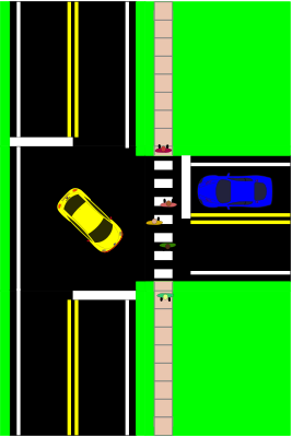 - asphalt automobiles autos cars crossing crosswalk Decideware Images double yellow line intersection pavement pedestrian pedestrian crossing pedestrians people people in crosswalk remix remix+2054 remix+61201 road road intersection sidewalk street street intersection three way intersection T intersection top view traffic transportation vehicles white line