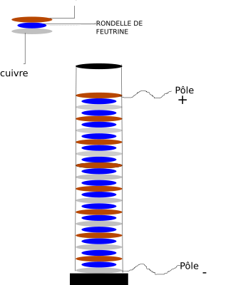 A voltaic pile diagram with the positive and negative ends.
