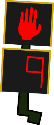 A crosswalk signal showing the symbol for "don't walk" and a countdown timer.